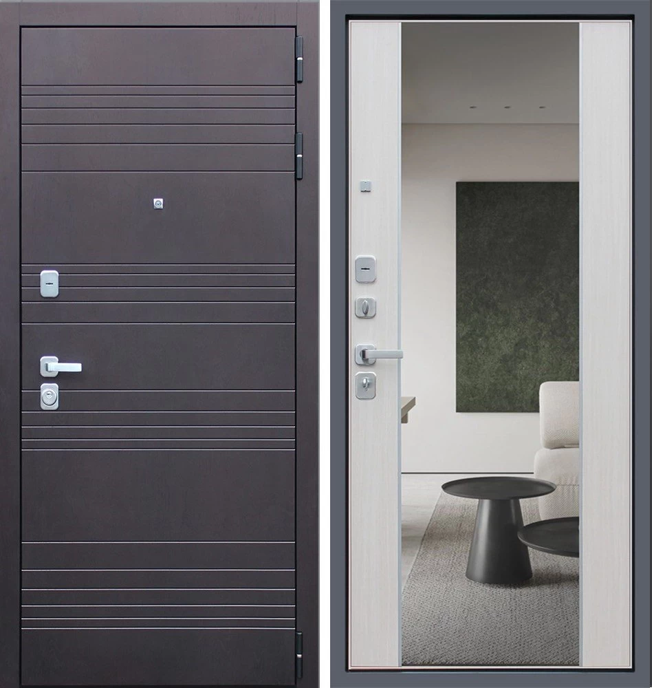 Надежная входная Дверь Дуэт с зеркалом премиум класса по цене 46 889 руб. Большая толщина стали защитит от проникновения в ваш дом, квартиру или коттедж. Используется очень качественная фурнитура: замки, цилиндры, ручки, защелки. Покрытие и отделка двери изготовлено под внимательным контролем производителя. Дверь имеет долгий срок службы и гарантию.