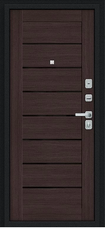 Надежная входная Дверь Браво Техно/BChrome Букле черное/Wenge Melinga премиум класса по цене 34 639 руб. Большая толщина стали защитит от проникновения в ваш дом, квартиру или коттедж. Используется очень качественная фурнитура: замки, цилиндры, ручки, защелки. Покрытие и отделка двери изготовлено под внимательным контролем производителя. Дверь имеет долгий срок службы и гарантию.